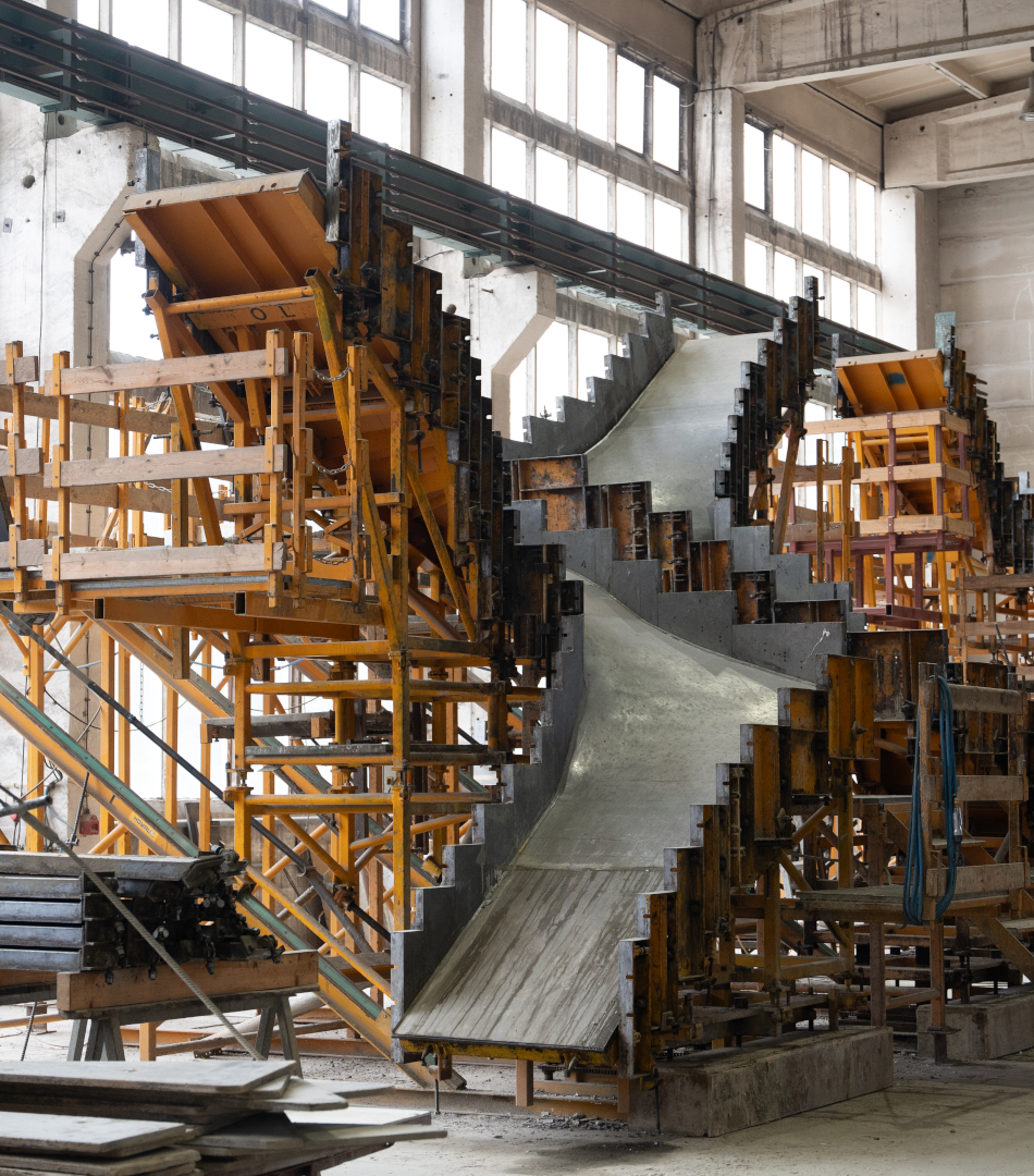 Als Ergänzung zu unserem Deckensystem bieten wir unseren Kunden gerade und gewendelte Treppenelemente für den Innenbereich an. Bei geradeläufigen Treppen können Stufenhöhe und -breite dem Kundenwunsch angepasst werden. Es sind maximal 18 Stufen bei einer Laufbreite von bis zu 3,00 m möglich. Mit unserem Formenpark produzieren wir verschiedene Formen von ½- und ¼-gewendelten Treppen. Unsere Treppen sind nach Montage sofort als Bautreppen benutzbar.